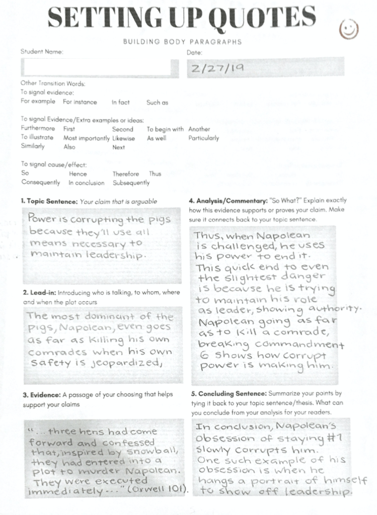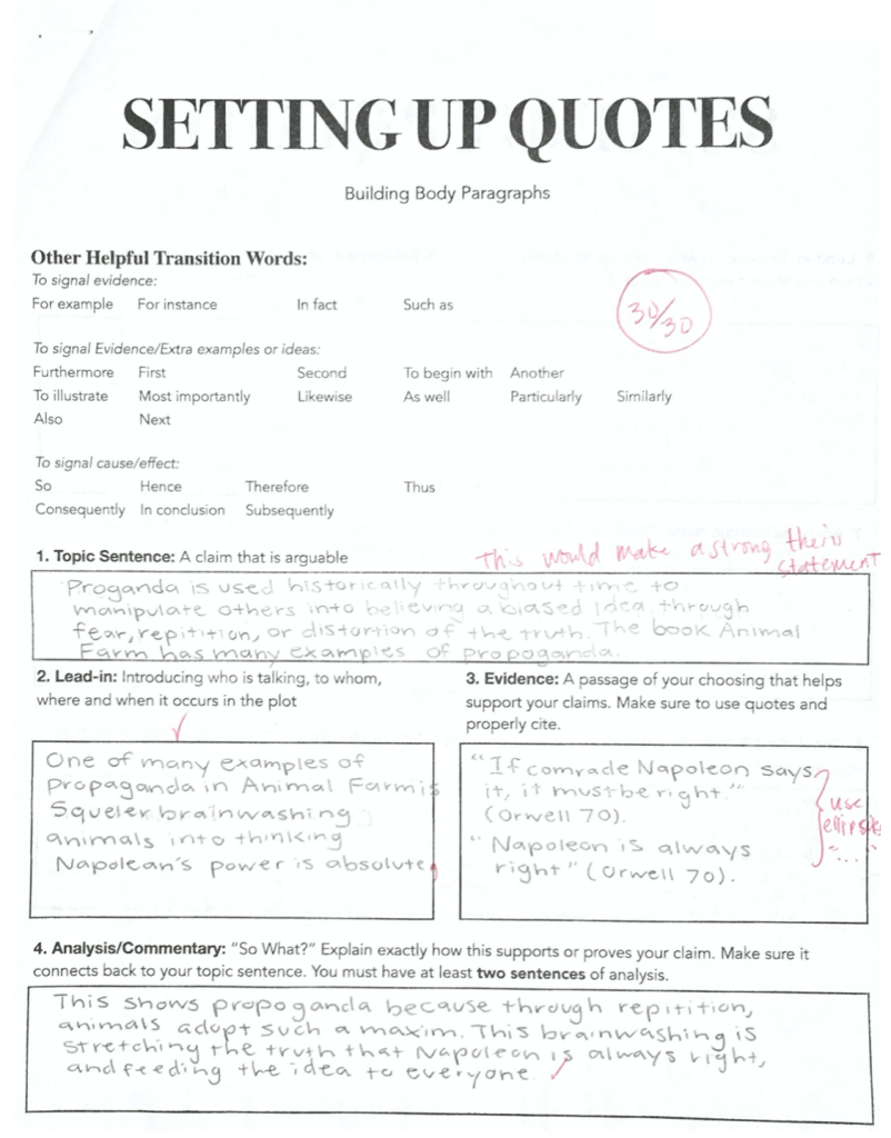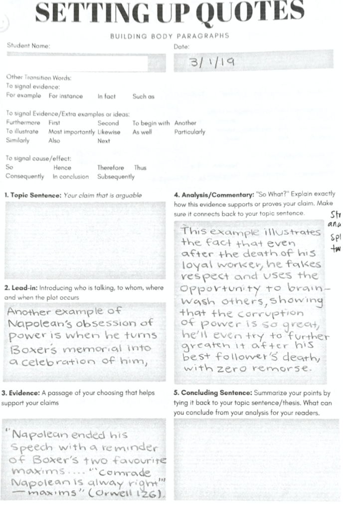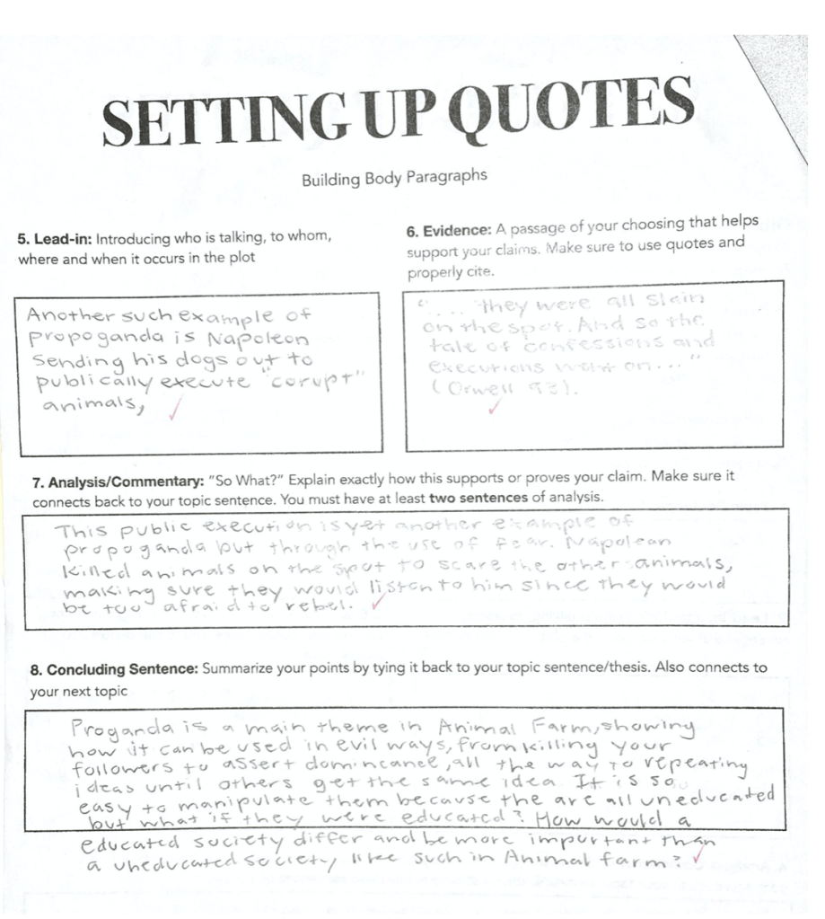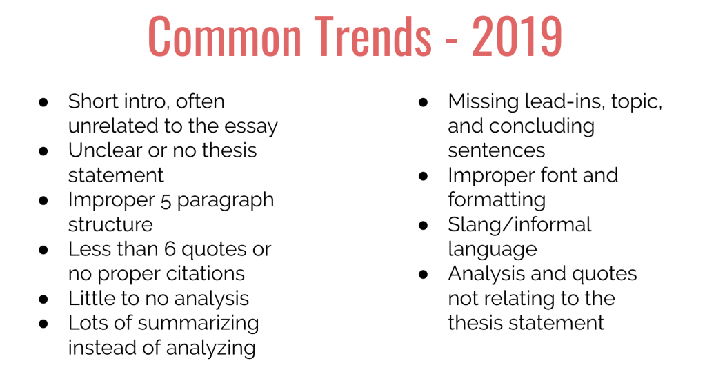 These are common essay mistakes after the first semester of the respective school year. In 2019, I taught 9th & 10th grade and noticed that they more or less had the same types of mistakes. If they were not a high achieving student, their essay was missing a lot of components. It was really clear that the student did not understand the purpose of or how to use topic sentences, evidence, analysis, concluding sentences, etc. Rather than just missing or incomplete parts, some of the essays didn’t make sense or lacked cohesion altogether—which told me there was a lack of clarity on my part.