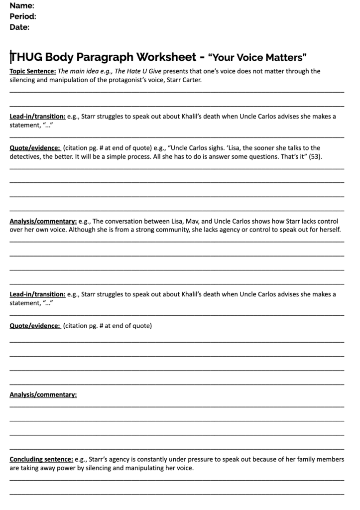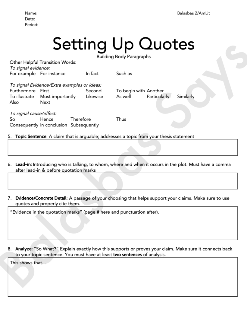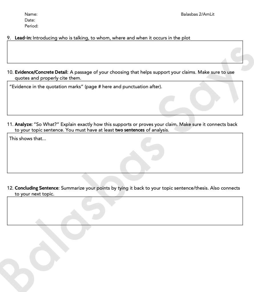 One of the most stressful things about teaching was realizing I didn’t have any worksheets for students to complete. Not just for busy work, but to help me teach. So the first one, I just whipped out because I could not find the one my master teacher used which had a T.E.A (Topic, Evidence, Analysis) formatting. The current (4th) version of the worksheet is the one with the watermark. I revised some of the language in each step after analyzing some student work with my mentor/coach.