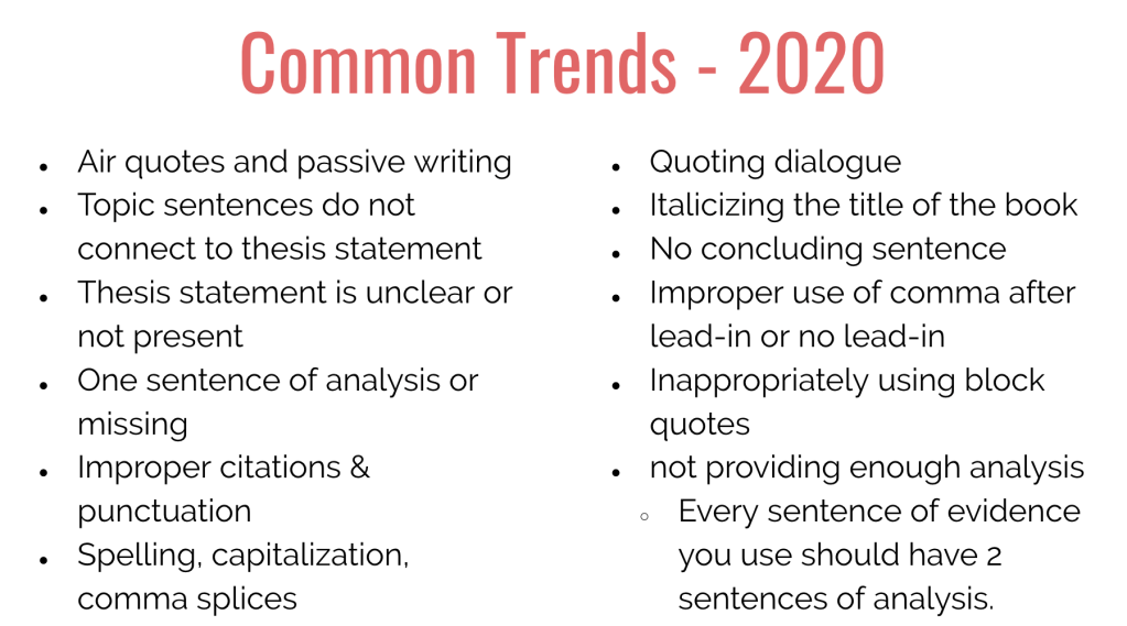 In the 2020 common trends, I noticed a major change. Students were not making the same mistakes anymore. Instead, a majority of the common trends I found were formalities in spelling, punctuation, citations, formatting, etc.—which were a nuisance to make note of on every paper, but for the most part I was reading complete essays. And over the last few weeks I have been asking myself, why is that? Why are there more formality errors this year and not conceptual ones. Especially when I have been given mainstream classes and not students in an honors program.